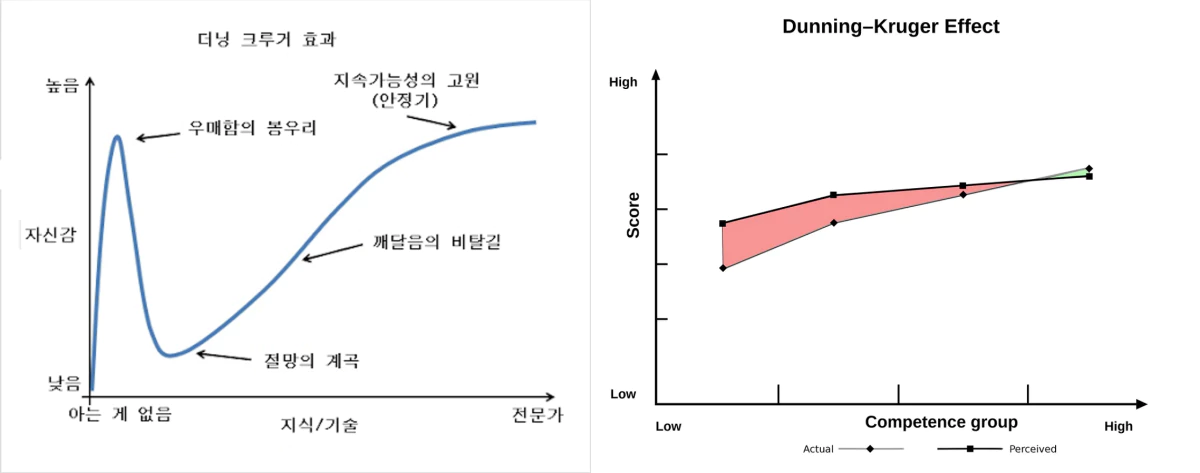 (좌)잘못 알려진 더닝 크루거 효과 그래프 - (우)실제 발표된 더닝 크루거 효과 그래프