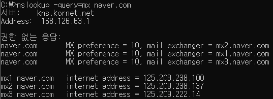 nslookup -query=mx 도메인명