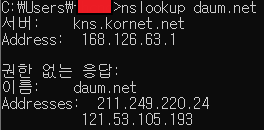위 그림처럼 daum.net의 ip 주소를 확인할 수 있습니다.