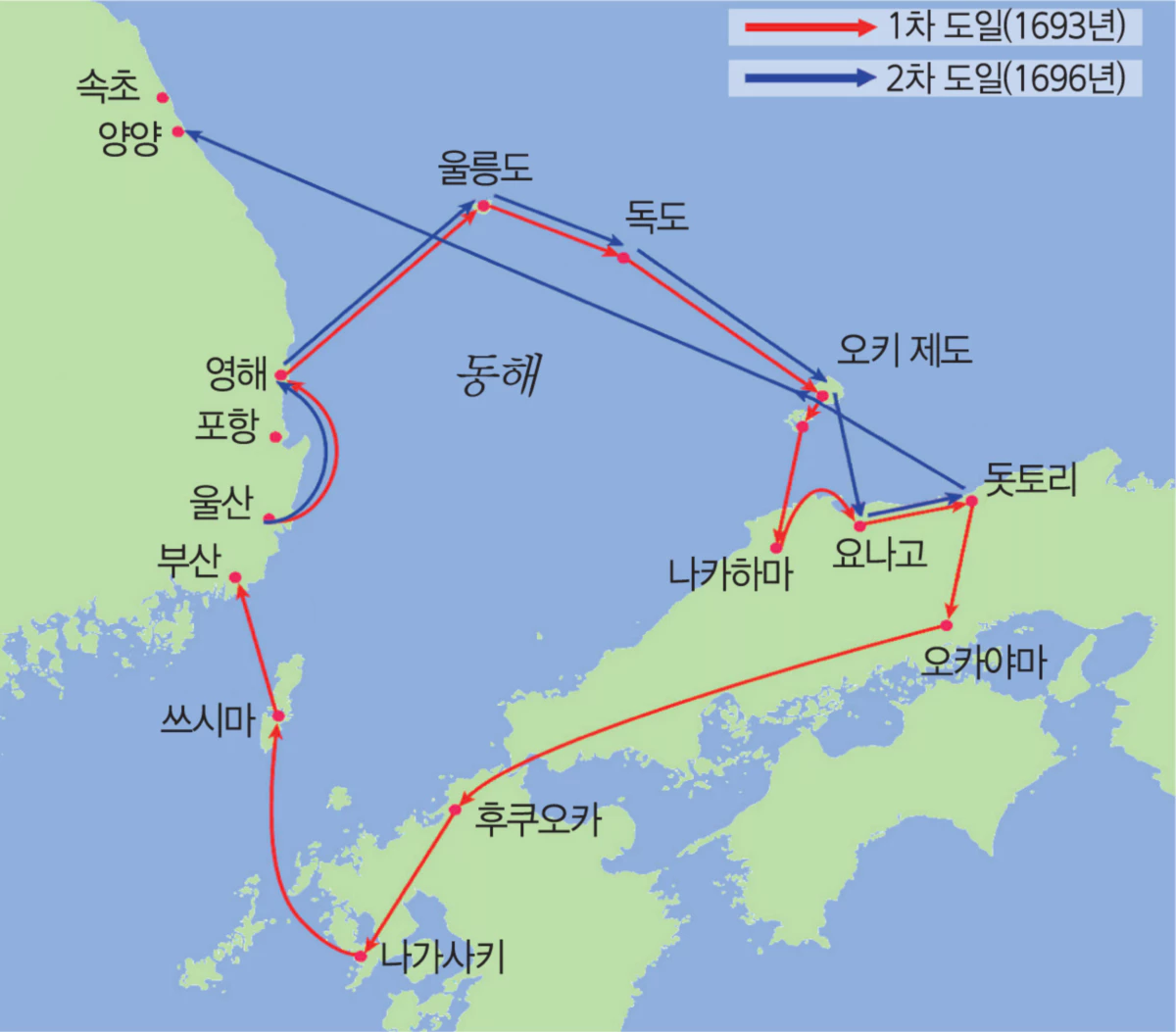 안용복은 1696년 (숙종 22)에 다시 울릉도로 갔습니다. 그러나, 그는 일본인들이 독도에도 들어와 있음을 발견했습니다. 안용복은 화가 나서 일본인들에게 독도가 조선의 땅이라고 말하고, 쫓아냈습니다. 그리고 울릉도와 독도가 조선의 영토임을 확실히 하기 위해 일본으로 건너갔습니다. 그는 울릉우산양도감세관이라고 속이고, 호키주 태수와 에도 막부에게 대마도주의 비리를 고발했습니다. 그 결과, 막부는 울릉도와 독도가 조선의 영토임을 인정하고, 일본인들의 출어를 금지하는 서계를 줬습니다. 이 서계는 「조선팔도지도」라는 제목으로 1696년에 발행되었고, 울릉도와 독도가 강원도에 속한다고 표시되어 있습니다. 이 서계는 현재 일본의 시마네현에 보관되어 있습니다.