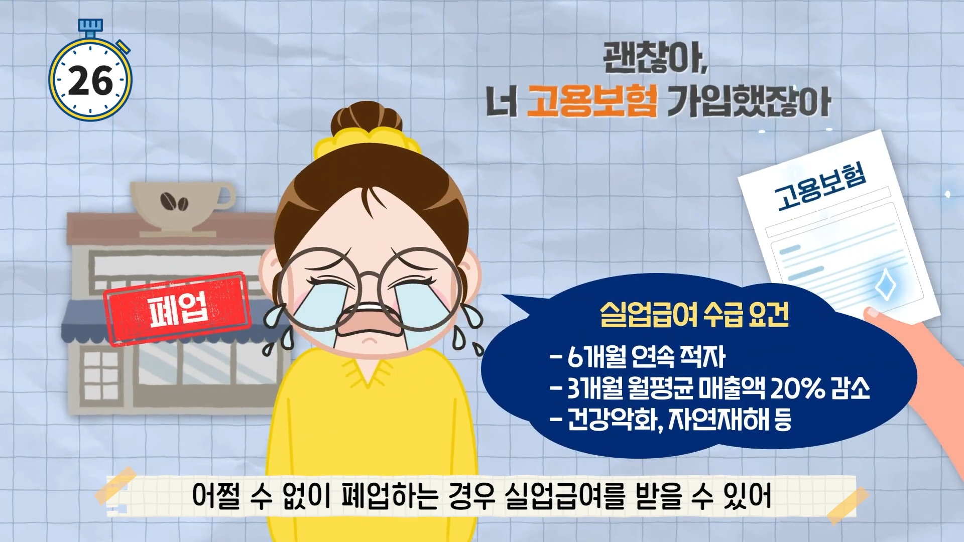 - 실업급여: 매출액이 감소하는 등 비자발적으로 폐업하고, 폐업일 이전 1년 이상 자영업자 고용보험료를 납부한 사업주