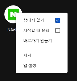 이때, 아이콘에 마우스 오른쪽 버튼으로 옵션을 보면 몇 가지 기능을 선택할 수 있습니다.