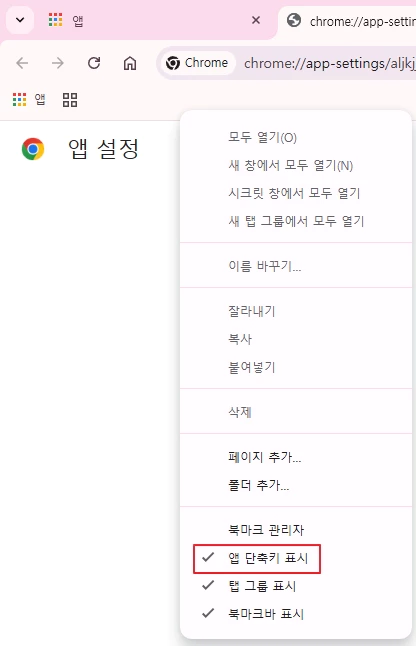 참고> [앱 표시] 버튼은 북마크 바에 마우스 오른쪽 클릭을 해서 표시 여부를 정할 수 있습니다.