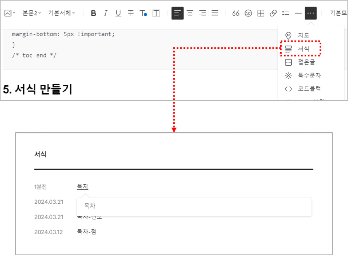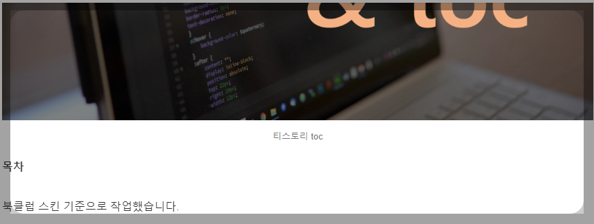 - 글쓰기 모드에서는 아래 [목차]란 글씨만 보이지만, 발행하면 정상적으로 표시합니다.