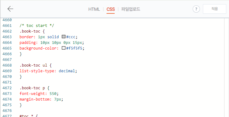 [ css ] 탭으로 이동해서 맨 끝에 아래 코드를 추가합니다.