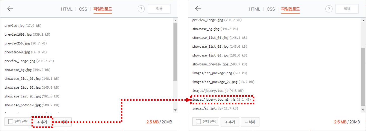 둘 중 아무거나 상관없이, [파일업로드 → 추가 ]로 파일을 올려줍니다.