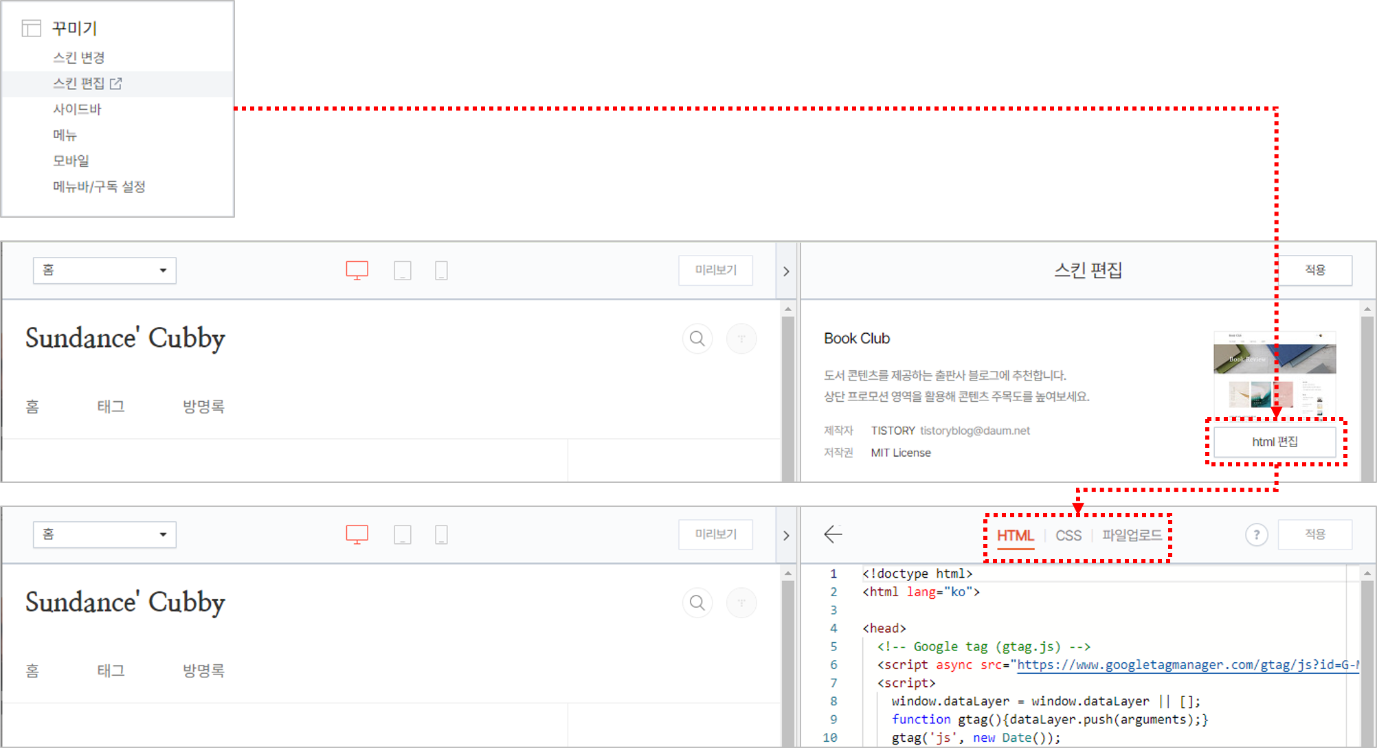 아래 이미지를 참조하여, [ 관리자 화면 → 스킨편집 → html편집 ] 으로 이동하면 [ html | css | 파일업로드 ] 탭메뉴가 보입니다. 여기서 작업을 진행합니다.