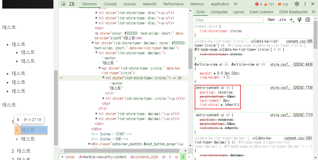 크롬 개발자 도구로 찾기 List 간격 찾기