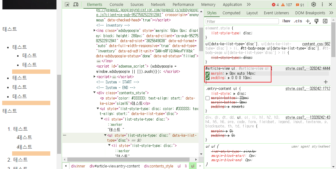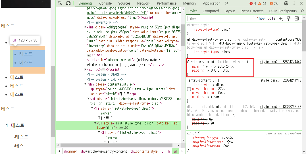 [html 편집 → css]로 가서 #article-view ul 을 찾아서 수정합니다.
