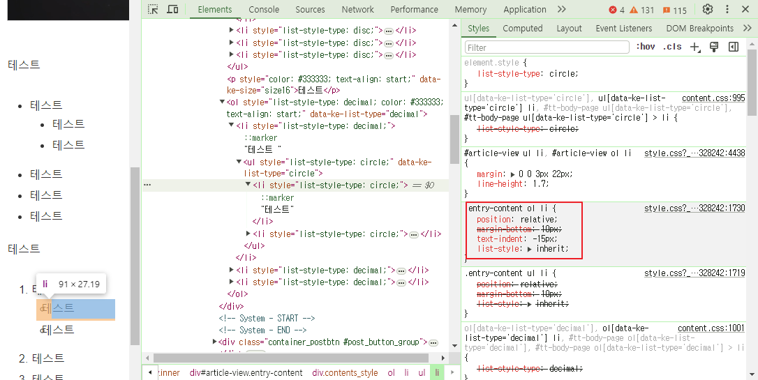 text-indent: -15px로 되어 있습니다. 이 부분을 개발자 모드에서 값을 text-indent: 0px으로 수정하여 확인해 봅니다.