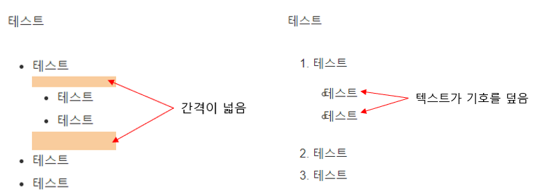 용어를 모르겠어서, 숫자 List의 하위 List 텍스트 간격이라고 했는데, 숫자로 된 리스트의 하위 리스트의 경우에 텍스트가 기호를 침범합니다.