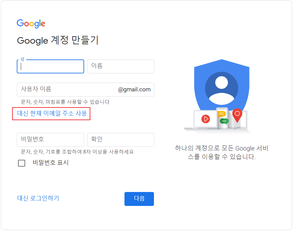 이제 현재 사용하던 메일로 구글 계정을 만들 수 있습니다.