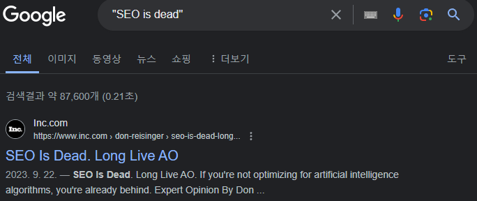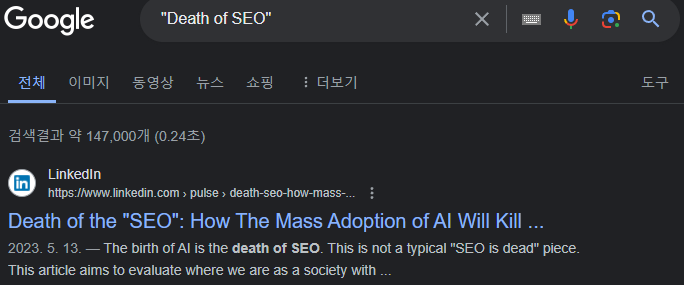 잠시 과거로 가보겠습니다. 2016년 1월 이후, SEO 세계는 놀라운 수의 조의문을 목격했습니다. 구글의 알고리즘 업데이트, 음성 보조, TikTok 댄스, 그리고 이제 ChatGPT까지 모두 SEO의 가상의 집행자로서 차례를 가졌습니다. "SEO is dead" 혹은 "Death of SEO"를 구글에서 검색하면, 약 90,000에서 100,000개의 결과를 자랑스럽게 찾을 수 있습니다. 그러나, 불사조처럼 재에서 일어나듯, SEO는 여전히 더 강력하고 더 회복력 있게 지속되고 있습니다.