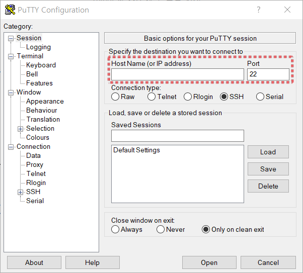 putty에 주소와 포트를 입력하고, Open으로 실행