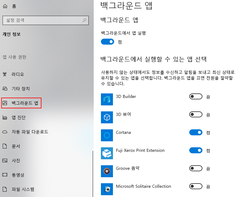 2. [백그라운드 앱]을 선택하면 아래와 같은 화면이 보입니다. 여기서, 필요없는 앱들을 꺼주시면 됩니다.